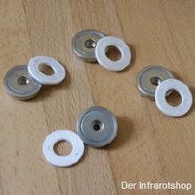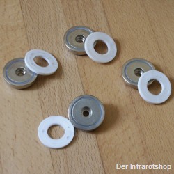 Das Set beinhaltet 4 Stück Magnethalter (Tragkraft 24 kg / Stück, Durchmesser 30 mm, Höhe 8 mm, Bohrung 5,5 mm) und 4 Distanzringe.