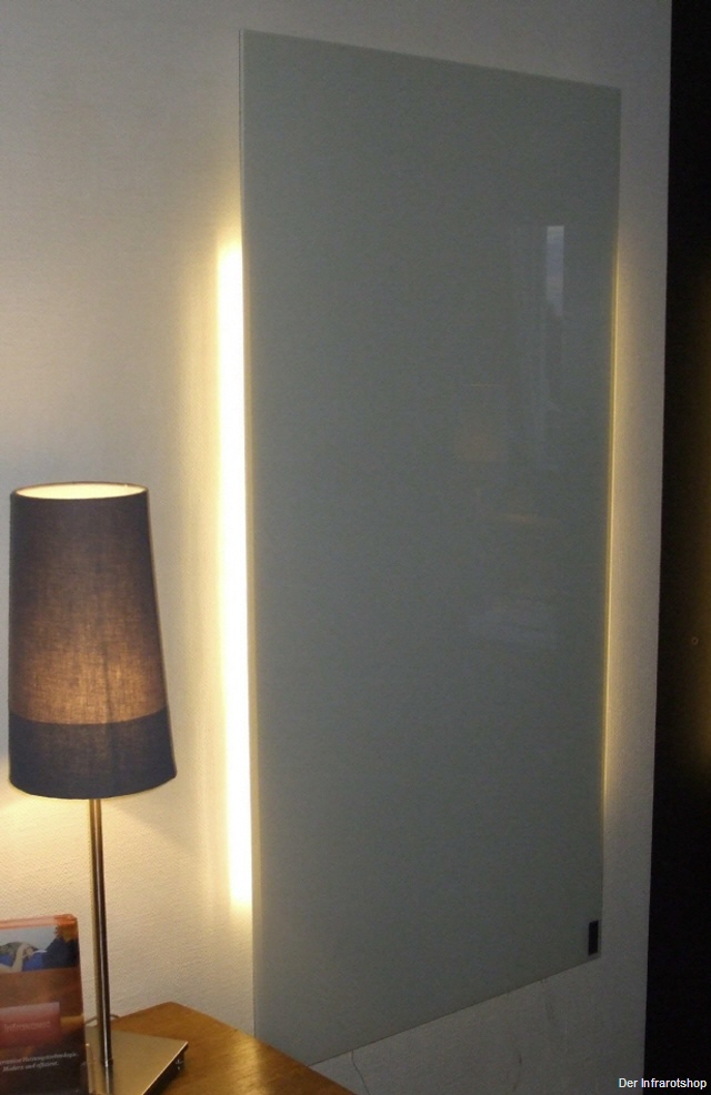 Infranomic Glasheizung "Slim Line" aus weißem (Verkehrsweiß RAL 9016 ) oder schwarzem (Verkehrsschwarz RAL 9017) Einscheibensicherheitsglas, rahmenlos mit Metallrückwand.
