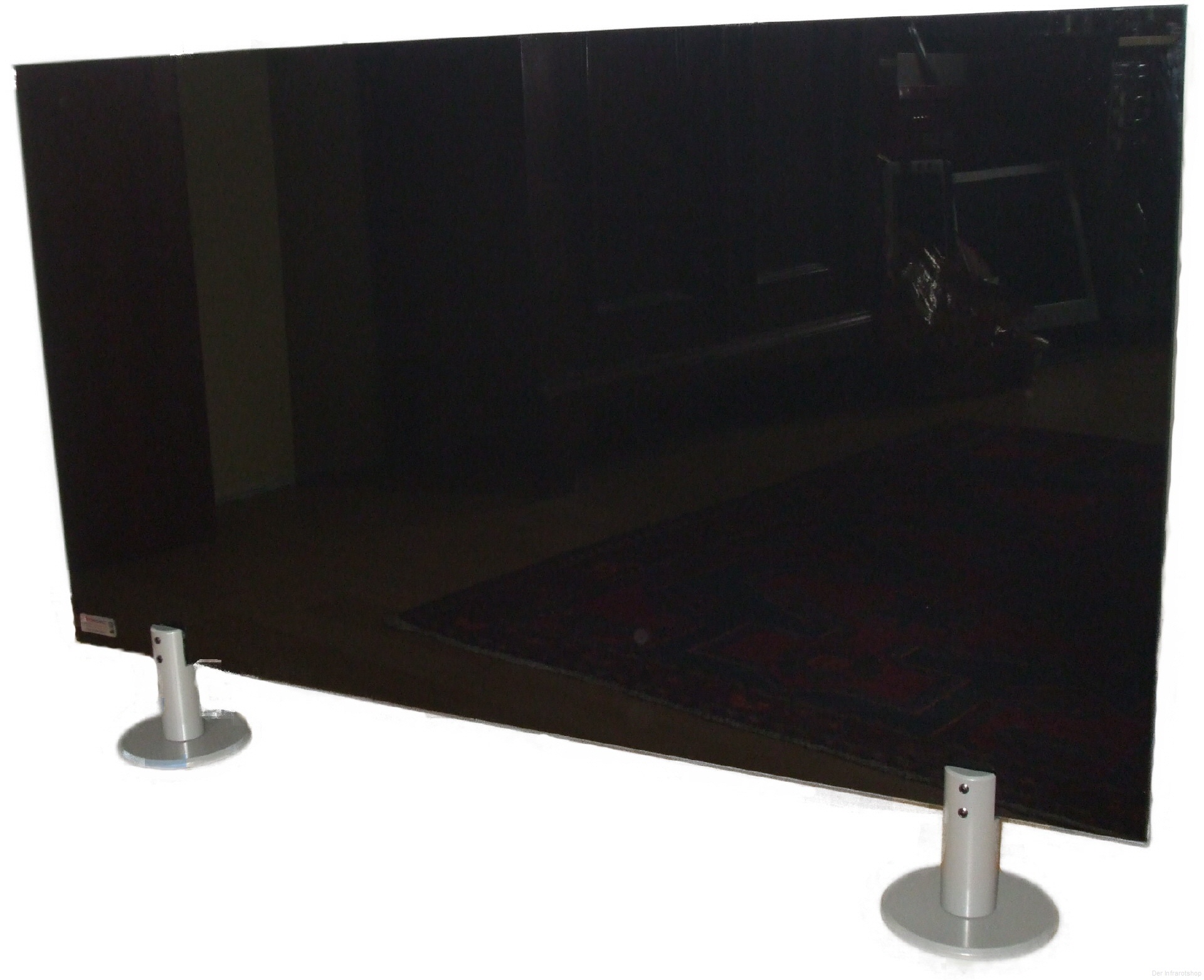 Infrarot Glasheizung zur freien Aufstellung mit weißem (RAL 9016 Verkehrsweiß) oder schwarzem (RAL 9017 Verkehrsschwarz) Glas, rahmenlos Rückseite Glas in Frontfarbe.