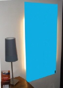 Die Frontscheibe ist mit einem umlaufend 4 cm breiten sandgestrahlten Streifen versehen, der durch innenliegende LEDs beleuchtet wird. Heizung und Licht werden unabhängig von einander gesteuert. Alurahmen 10 mm. Front Sicherheitsglas, Rückseite MDF grau. Mit Überhitzungschutz - TÜV-Süd geprüft.
