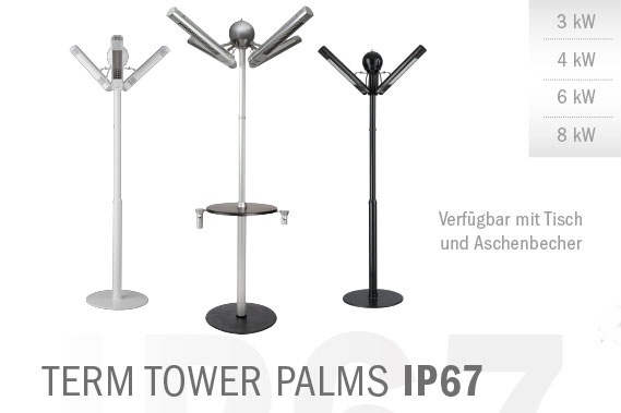 Der TERM TOWER PALMS ist mit zwei bis maximal vier wasserdichten Infrarotheizstrahlern der Serie TERM 2000 IP67 ausgestattet. Für die Steuerung der Wärmeintensität und Betriebslaufzeit empfehlen wir unsere Thermostate, Dimmer und Timer aus unserem CONTROL Center