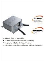 Mit dem Burda BTD3-Bluetooth Dimmer haben Sie die Wahl jederzeit aus 3 Möglichkeiten der Steuerung / Dimmung frei auszuwählen. Einfach und bequeme 3-stufige Dimmung direkt am Bluetooth Dimmer, per integriertem Schaltknopf, mit der serienmäßig mitgelieferten Infrarot Fernbedienung (bis zu 7 m Entfernung) oder auch mit Ihrem Handy bzw. Smartphone oder Tablet per Burda App für iOS oder Android Geräte (bis zu 50 m Entfernung möglich).