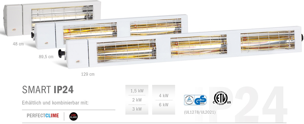 Burda Gastro-SMART Multi IP24. Mit zwei Heizröhren je 1500 Watt bietet der Doppelstrahler in Weiss volle Heizleistung in einem Bereich von etwa 24-26 qm.
