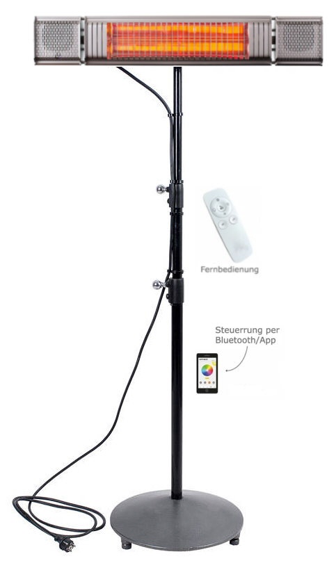 ebenfalls über App oder Fernbedienung, geregelt und allen Bedürfnissen angepasst werden. In höchster Stufe kann man die Wärme etwa 3,5 Meter weit, bei einer Breite von 5,5 Metern sicher spüren (Reflektor strahlt horizontal mit ca. 90° ab). Ausgestattet mit der aktuellen Amber Light Technik, 80% weniger Lichtaustritt wie bei herkömmlichen Infrarotstrahlern ohne Wärmeverluste.