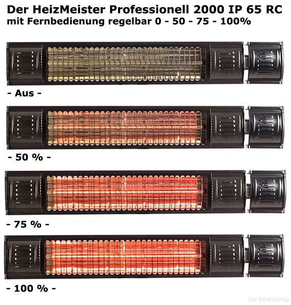 Der Heizmeister 2000 IP65 RC ist ein Heizstrahler der neuesten Generation mit schwarz lackiertem Alu-Gehäuse, ausgestattet mit einer HeLen-Goldröhre und inklusive Fernbedienung und Netzschalter.