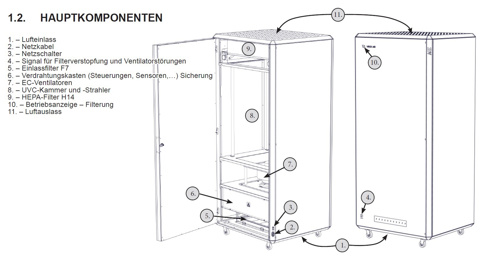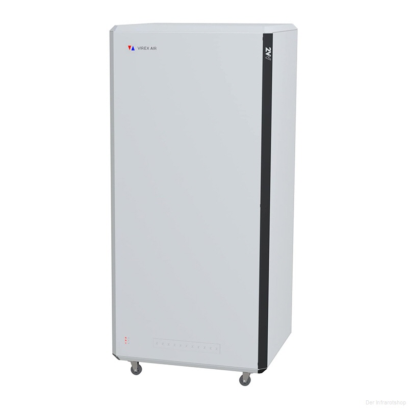 Dieser Luftreiniger wird zur Reinigung und Desinfektion der Raumluft in typischen Innenräumen eingesetzt. Er ist vor allem für Räume mit größeren Personengruppen konzipiert, wie z. B. Klassenräume, Wartezimmer, Großraumbüros, Fitnessstudios usw. Der VIREX AIR ist mit einer zweistufigen Filterung, einem sparsamen und leisen EC-Ventilator ausgestattet.