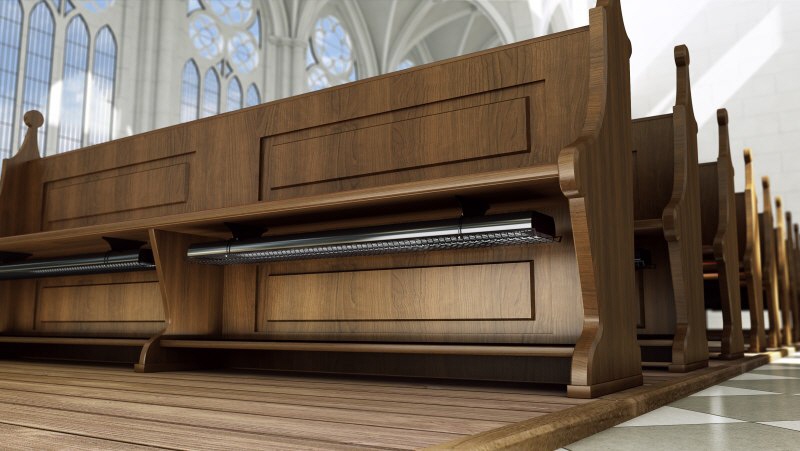 Die EcoSun CH ist für Aufhängung unter Sitze der Kirchenbänke bestimmt, wobei der Strahlungsfluss auf den Fußboden gerichtet ist. Dank Erwärmung des Fußbodens und auch dank teilweiser Konvektion erhöht sich der Wärmekomfort für die Besucher der Kirchen.